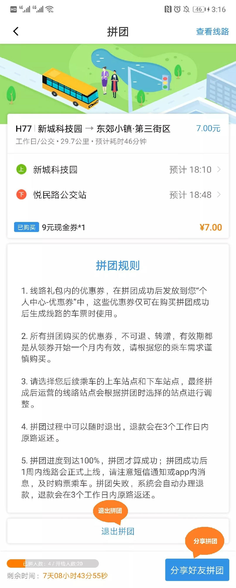 拼團(tuán)進(jìn)度達(dá)到100%之前點擊“退出拼團(tuán)”即可放棄拼團(tuán)系統(tǒng)都會將票款在3個工作日內(nèi)