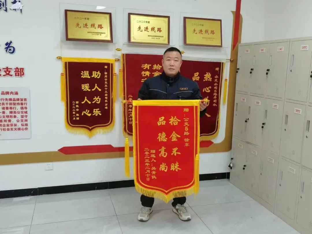 2月12日,王女士帶著印有“拾金不昧 品德高尚”的錦旗再次來(lái)到了御景灣調(diào)度室,親手送到了駕駛員徐東的手中以表感謝。