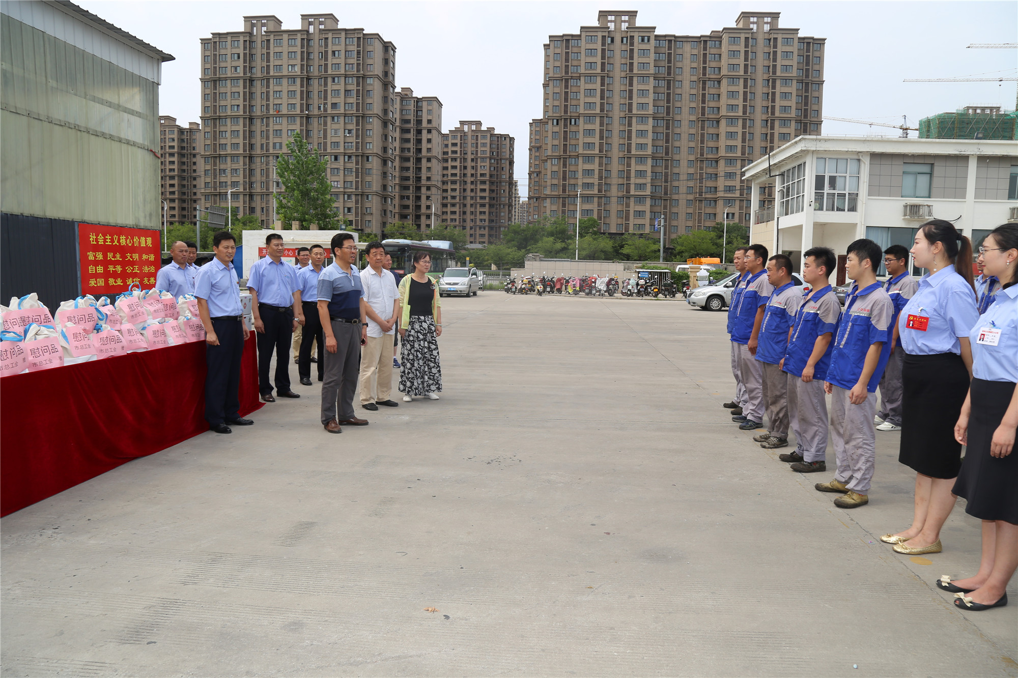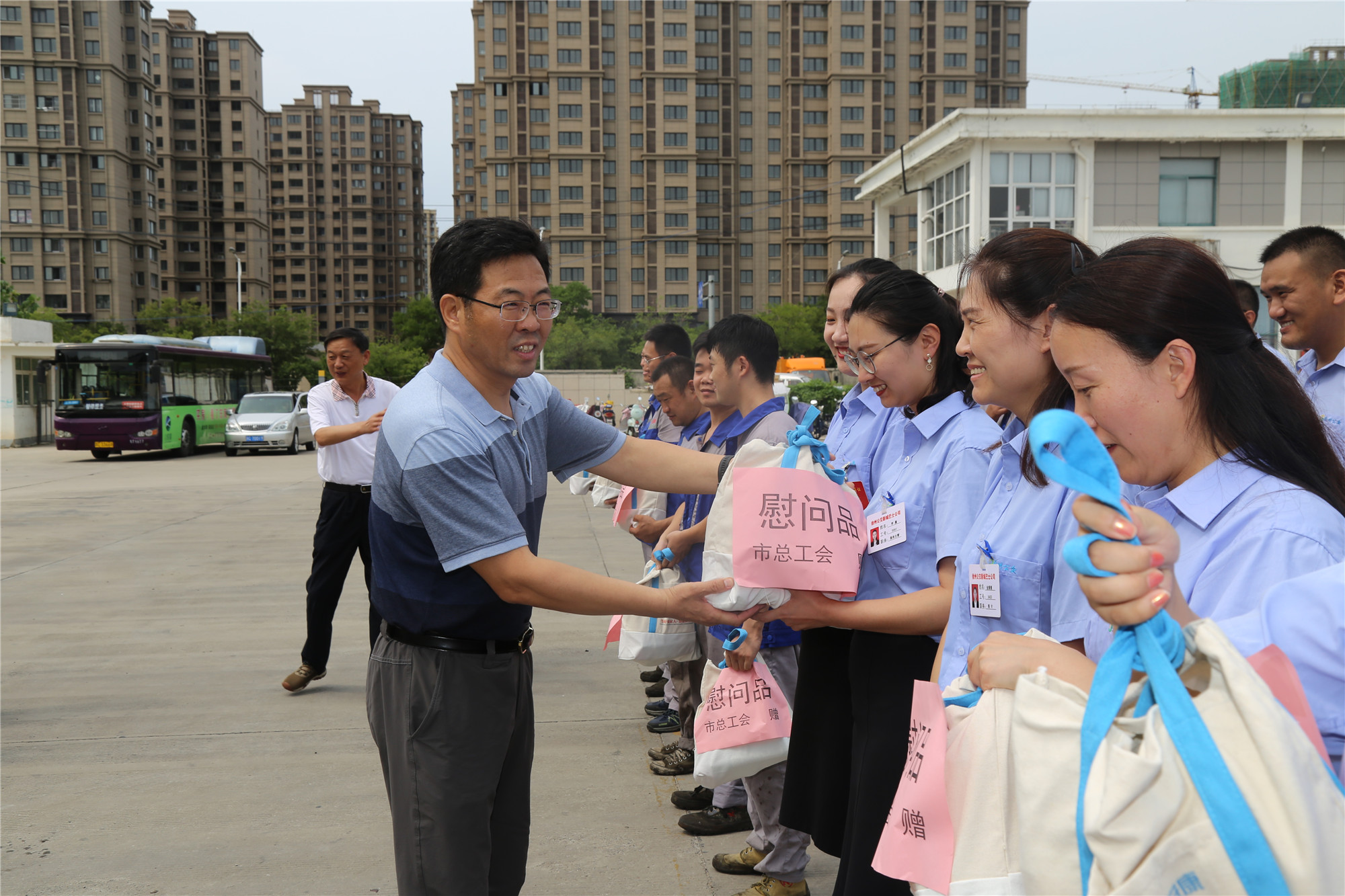 正值盛夏,近期我市持續(xù)高溫、濕熱多雨,持續(xù)攀升的炎熱天氣“烤驗(yàn)”著堅(jiān)守崗位的公交職工。三伏天里,工會(huì)娘家人總是心系一線職工安康,8月1日下午,徐州市總工會(huì)黨組成員、副主席王建民,副調(diào)研員馮相合等一行,在市交通運(yùn)輸局工會(huì)副主席巨玲和徐州公交公司總經(jīng)理馮陸陸,公司黨委副書記、紀(jì)委書記、工會(huì)主席竇同銀的陪同下,頂烈日冒酷暑來到郭莊路公交停車場,看望慰問了奮戰(zhàn)在高溫一線的公交職工,送來了高溫慰問品,更送來了殷殷關(guān)愛和叮嚀,讓大家感受到了夏日里的絲絲“清涼”。