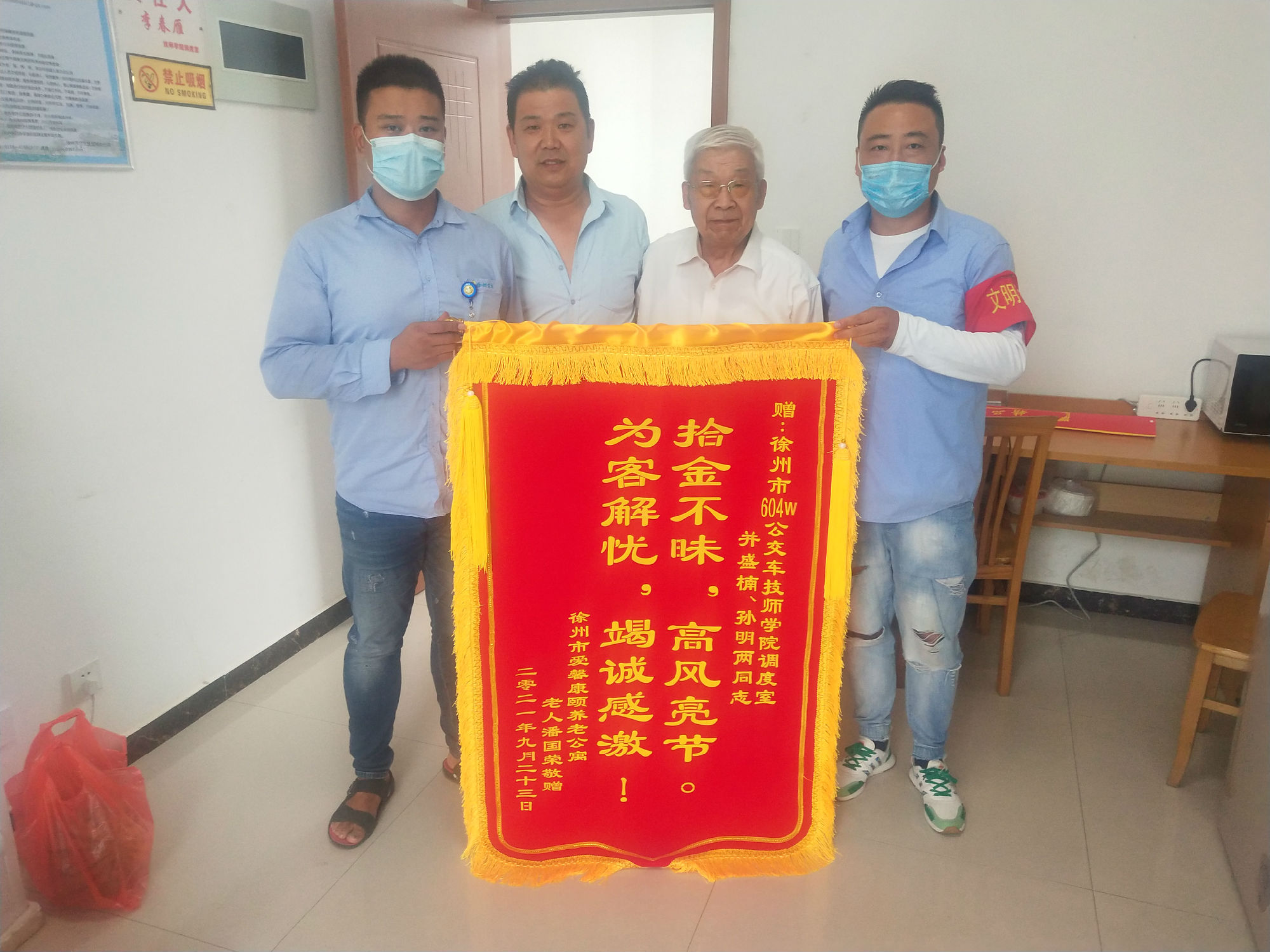 近日,一位老先生在家人的攙扶下,來到了城北公司604路技師學院調(diào)度室,將一面印有“拾金不昧,高風亮節(jié),為客解憂,竭誠感謝”字樣的錦旗送到604路駕駛員孫明和調(diào)度員盛楠手中。