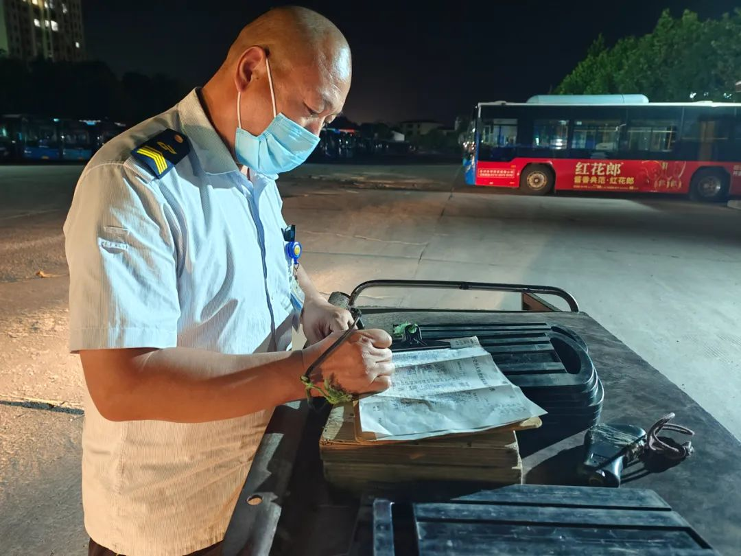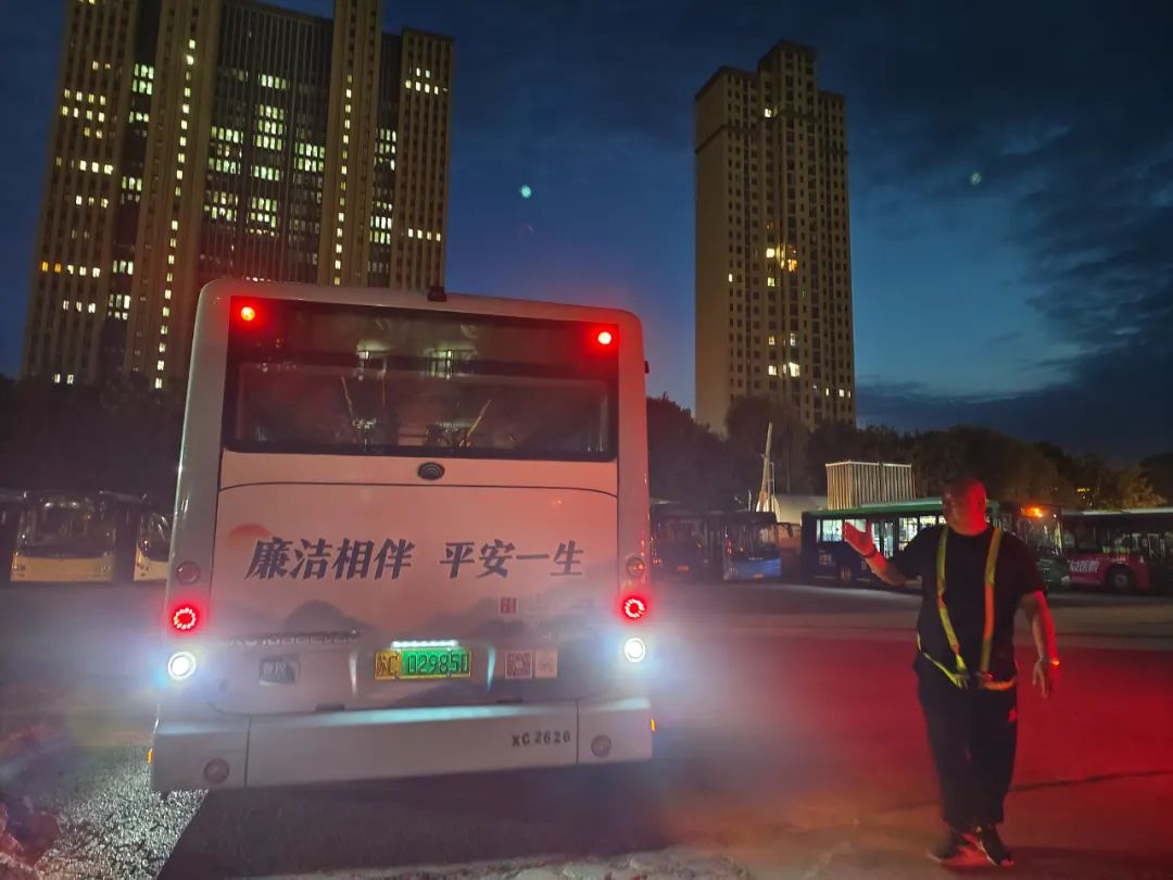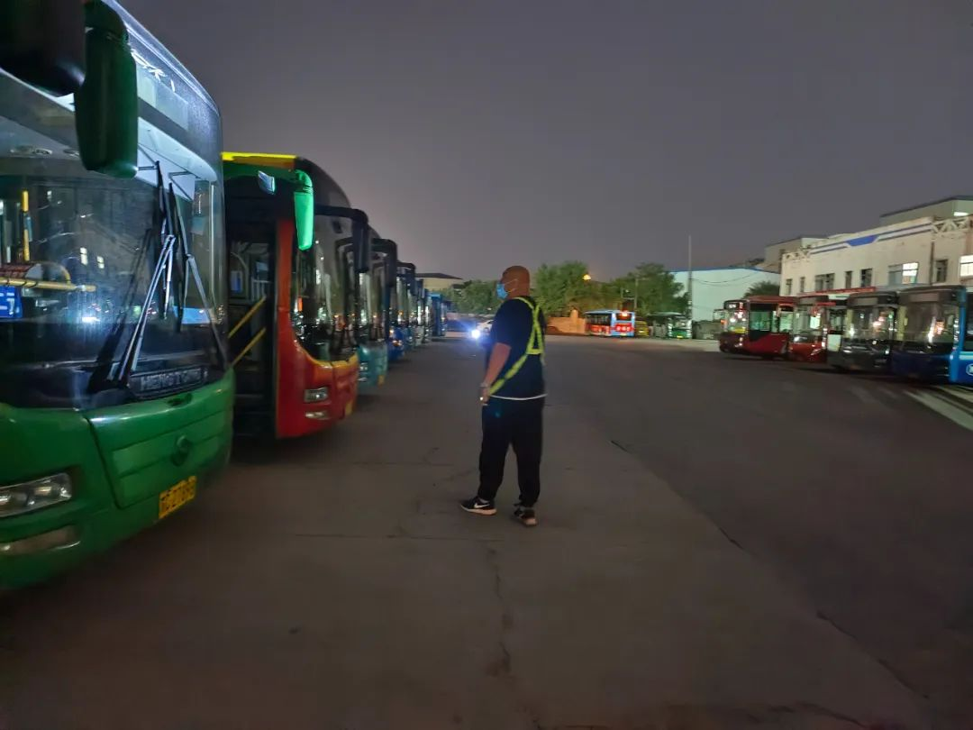 進入丑時,許多人都已進入夢鄉(xiāng),末班車回場,在萬籟俱靜的夜里,內保員徐智指揮倒車,同時還要逐個檢查停車場內的車輛擺放,匯報車輛歸場情況,確保車輛全部安全歸場。