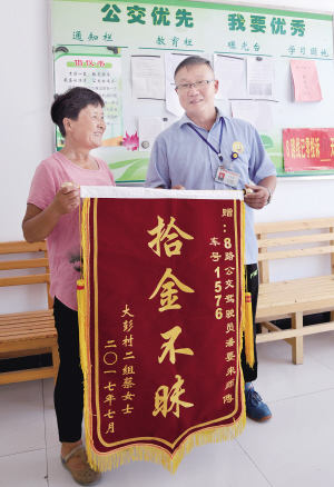 7月21日《都市晨報(bào)》A08版刊登了《急匆匆出門見朋友 3000多元現(xiàn)金遺失公交上》一文,講述了8路駕駛員潘要來拾金不昧的事跡。7月19日下午,家住銅山區(qū)大彭鎮(zhèn)的蔡女士從大彭鎮(zhèn)乘坐8路車到宣武,慌忙下車后,蔡女士忽然發(fā)現(xiàn)裝3000多元錢的布包不見了。兩人回憶,當(dāng)時(shí)忙著抱孩子了,把包遺失在了公交車上。蔡女士連忙回去,找到另外一名8路車駕駛員幫她聯(lián)系了8路調(diào)度室,很快傳來好消息:包找到了。原來,蔡女士乘坐的8路車駕駛員潘要來看到了座位上有一個(gè)東西,當(dāng)時(shí)他誤認(rèn)為是坐墊,后來,他看到有個(gè)乘客直接奔向那個(gè)座位,一屁股坐了下來,神色有些慌張。潘師傅從后視鏡看到,那個(gè)東西鼓鼓囊囊不像坐墊,便走了過去,將包拿回駕駛室。