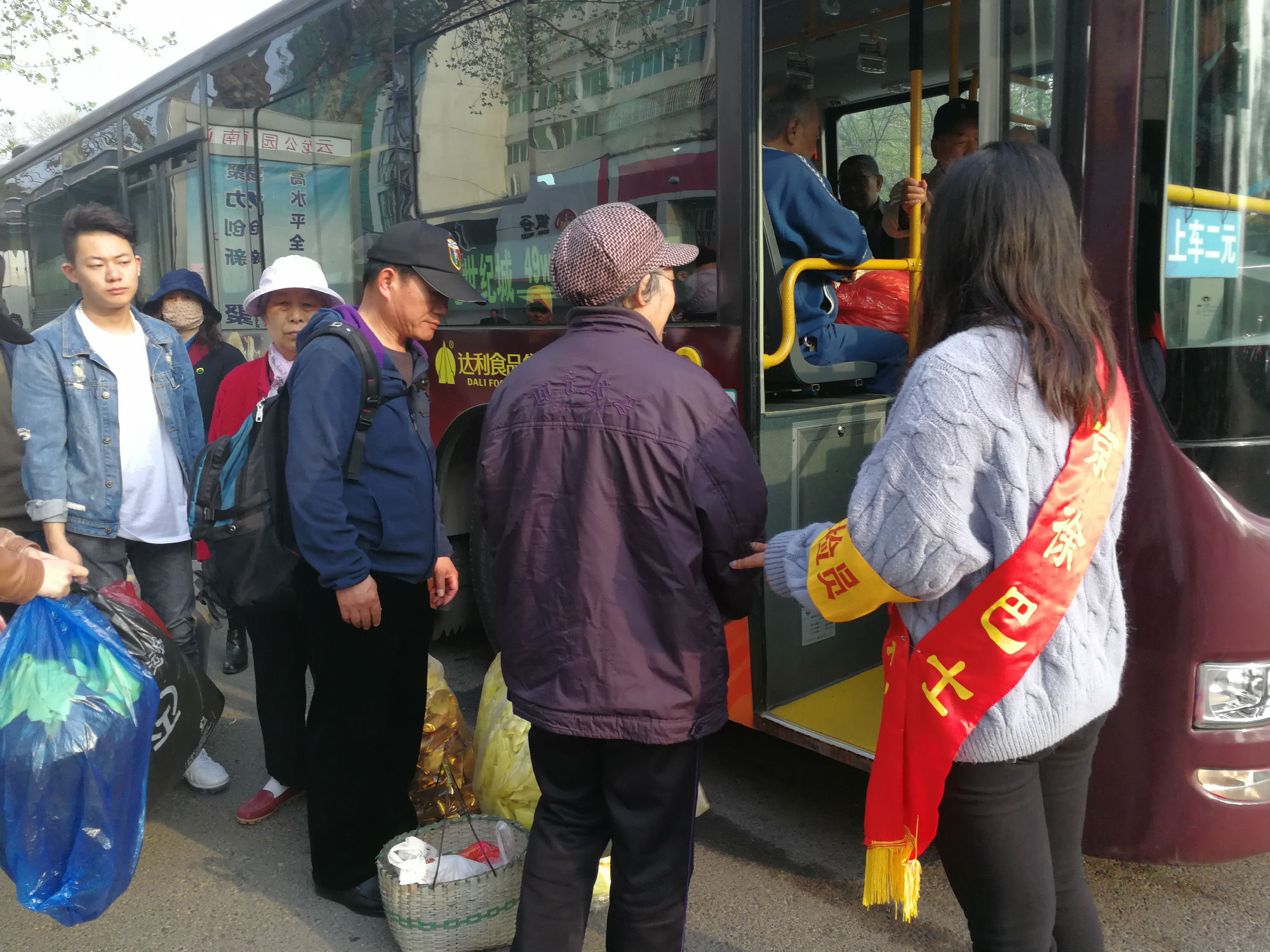 云龍公園南門,站滿了拿著大包小包的乘客?!按蠹遗藕藐?,注意安全,不要擁擠,需要換零錢的乘客可以到零幣兌換處換取零錢?!敝驹刚呶⑿χS持現(xiàn)場秩序。人群中有位提著兩個大包裹的大媽,志愿者走到大媽跟前,關(guān)切地詢問:“大媽,我來幫您把包裹拿上車吧。”志愿者一手攙扶老人上車,一手拿著物品,為其安排好座位并叮囑大媽注意安全。一班車走后,還沒撈著喝口水,現(xiàn)場又聚滿了乘客,志愿者們又開始忙碌起來:“大爺,車還要一會才能來,您先坐這歇一會吧?!敝驹刚吣脕戆宓剩尷洗鬆斪滦菹?,老大爺十感動,說道:“你們真貼心。